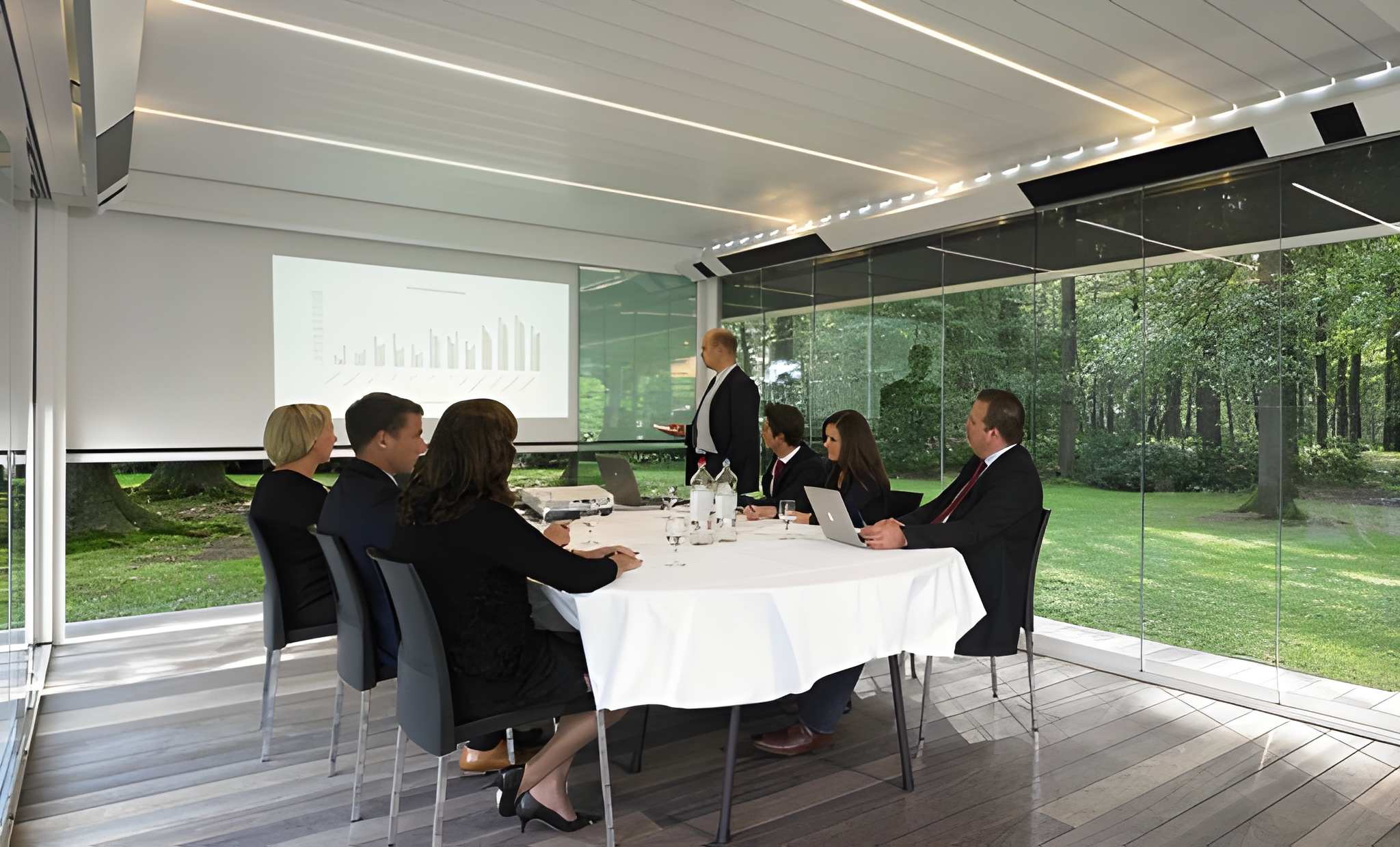 Mīksts, ievelkams jumts vai jumts ar lamelēm var nodrošināt papildu ēnu komfortam garās darba dienās, savukārt sānu elementu, piemēram, bīdāmo durvju vai sānu aizslietņu pievienošana palīdzēs novērst atspīdumus klēpjdatora ekrānā. Varat apsvērt arī stikla sienas vai cita veida apšuvumu papildu klimata kontrolei vai aizsardzībai pret vēju, kukaiņiem vai nokrišņiem.