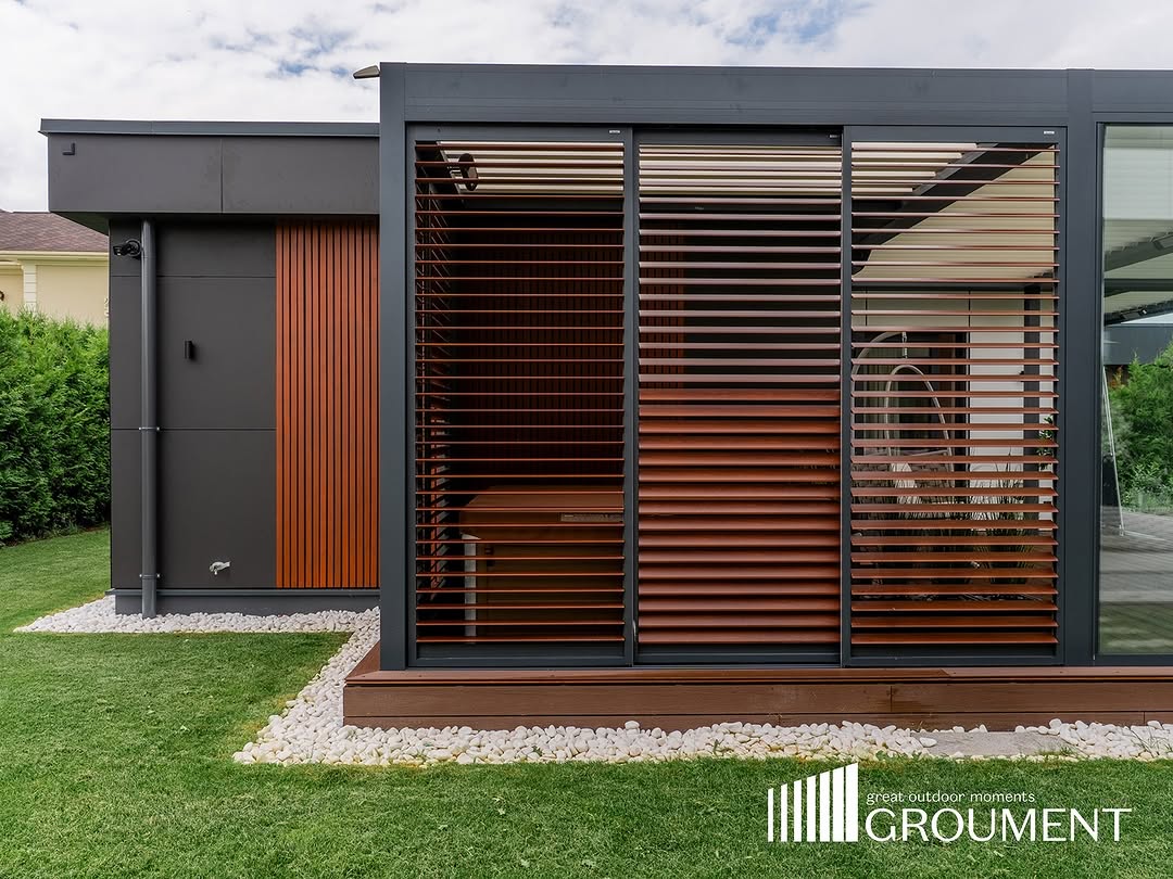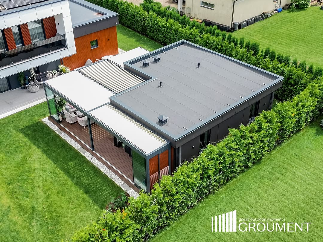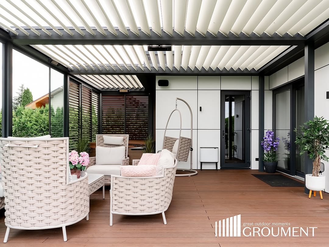 Šajā projektā īstenojām kompleksu risinājumu, kurā četras bioklimatiskās pergolas tika apvienotas vienotā konstrukcijā, veidojot funkcionālu un daudzpusīgu ārtelpu.