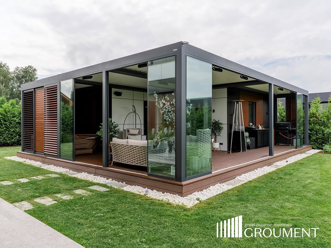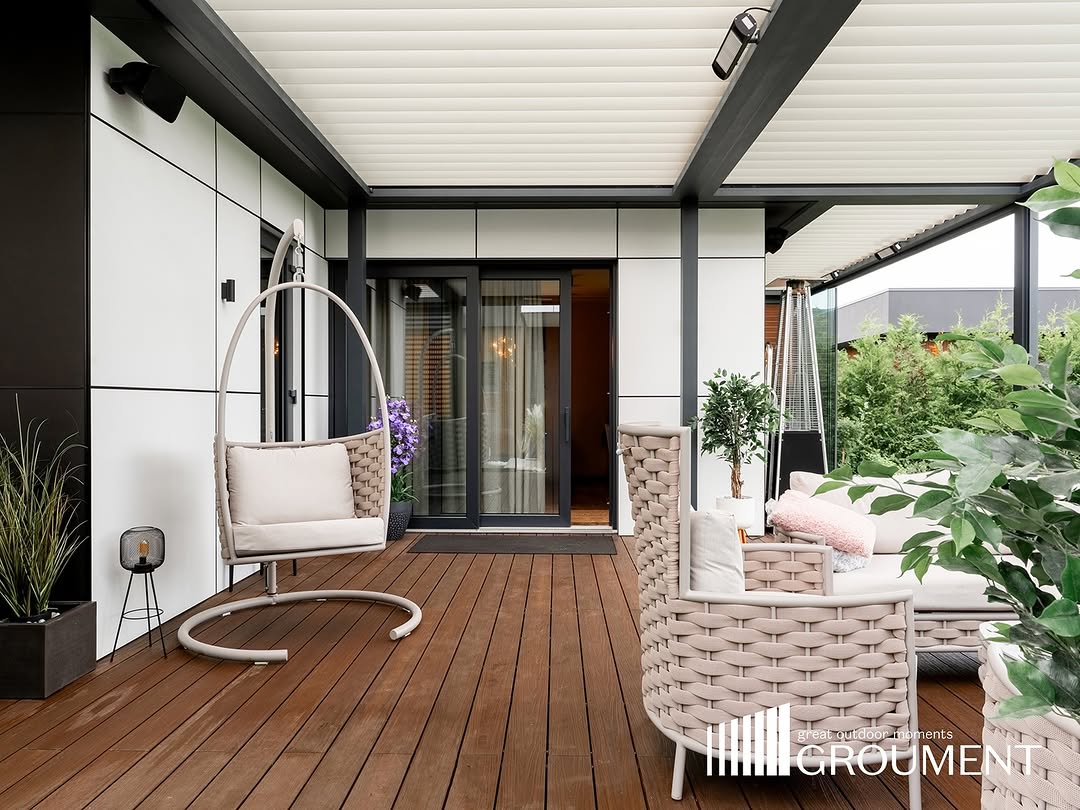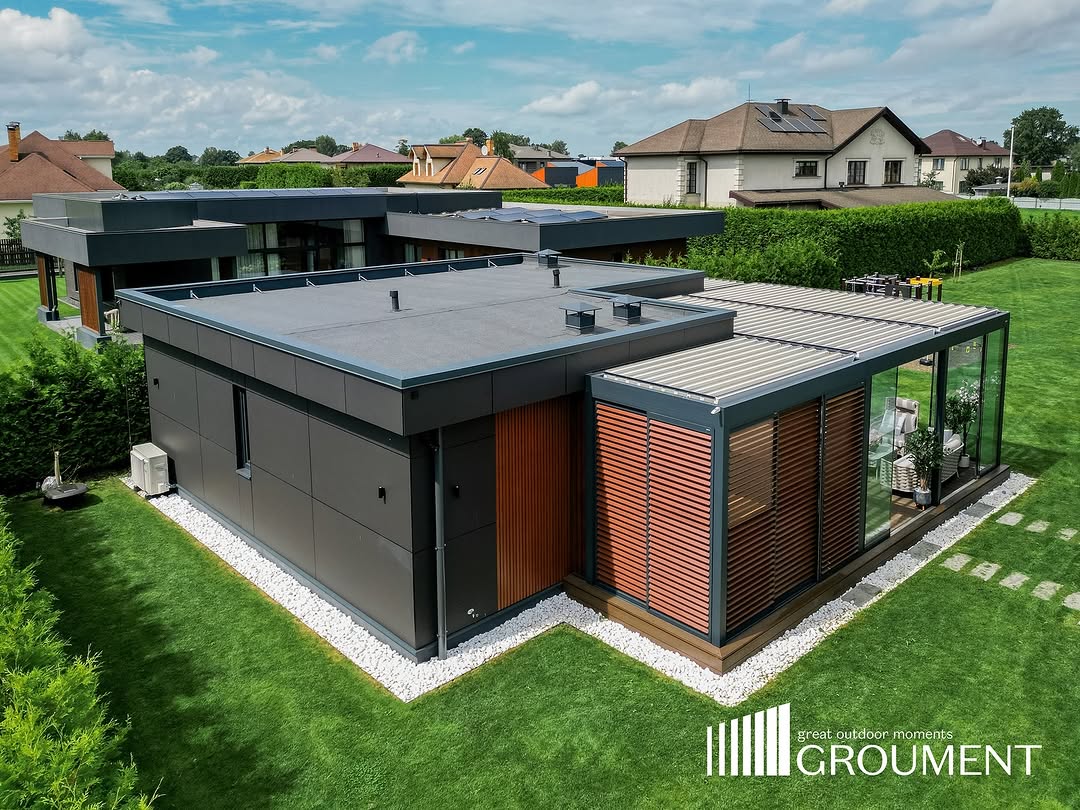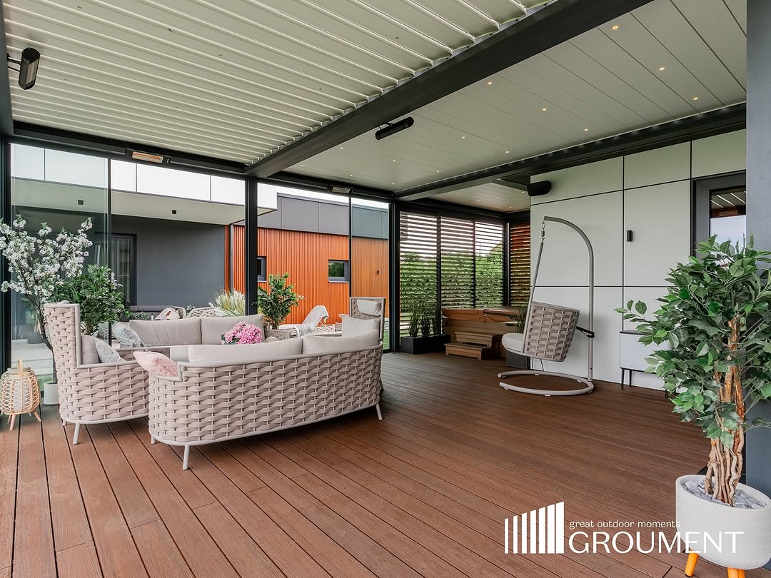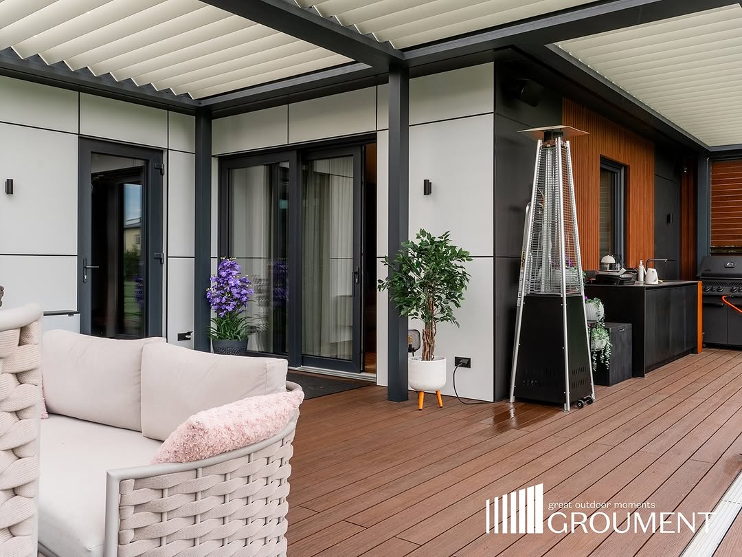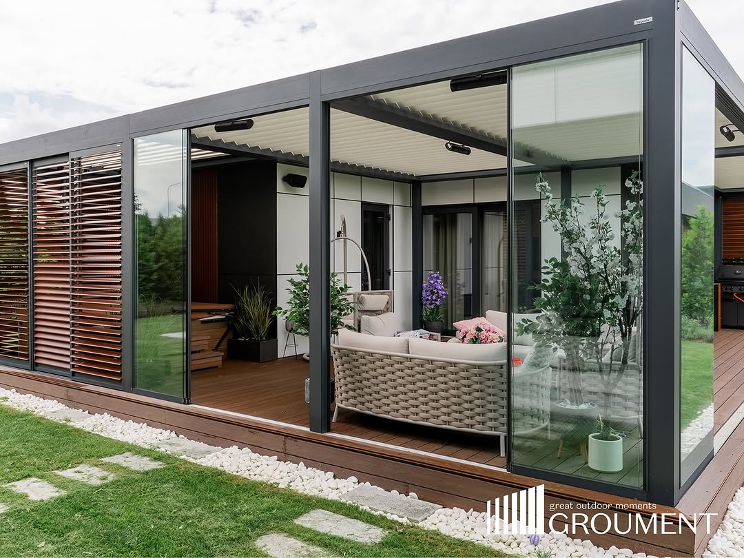 Komplekss risinājums ar apvienotām pergolām, stiklojumu, apgaismojumu un komforta tehnoloģijām vienotā arhitektūrā